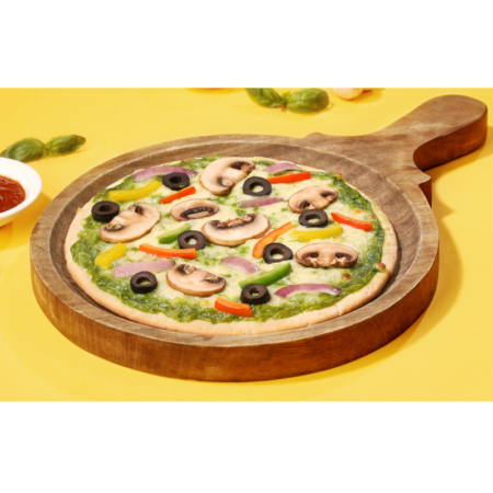 (Home Made Creamy fresh Basil Pesto sauce, Assorted Exotic Vegetables, Orange Cheddar Cheese, Black Olives) -