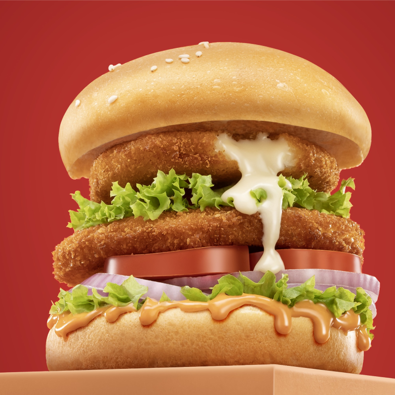 Twice the indulgence with two juicy patties stacked high, layered with melted cheese and bold sauces for an extra-loaded, mouth-watering bite.